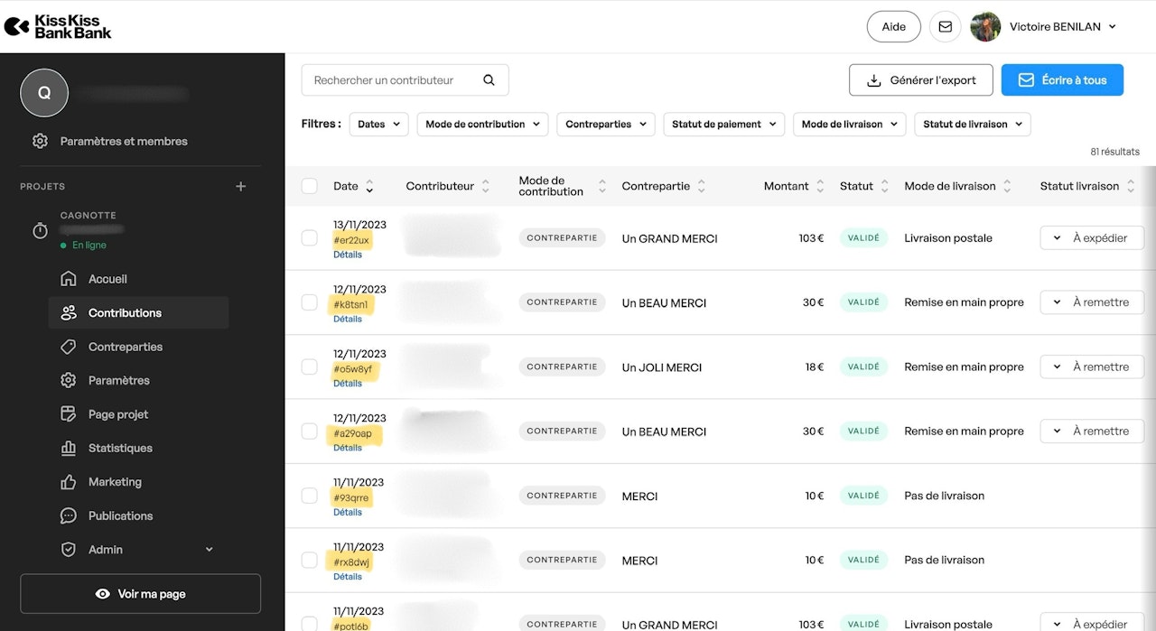 De votre côté, vous pourrez utiliser cette référence pour rechercher une commande sur la page Contributions de votre gestionnaire de projet. Les références de commande sont également visibles dans la liste des contributeurs que vous pouvez télécharger depuis cette même page.