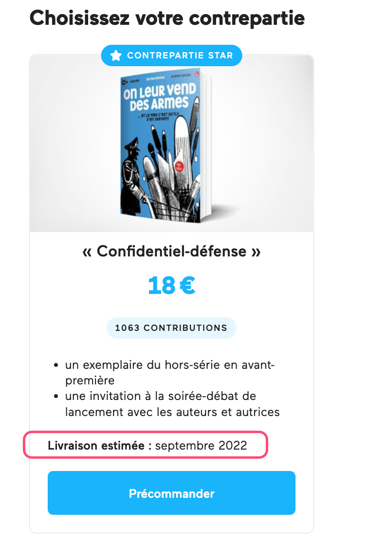 La date de livraison estimée que vous allez définir sera affichée sur la contrepartie et sera une composante du choix de vos contributeurs.trices. Soyez prudent.e et estimez toujours en tenant en compte des éventuels retards :