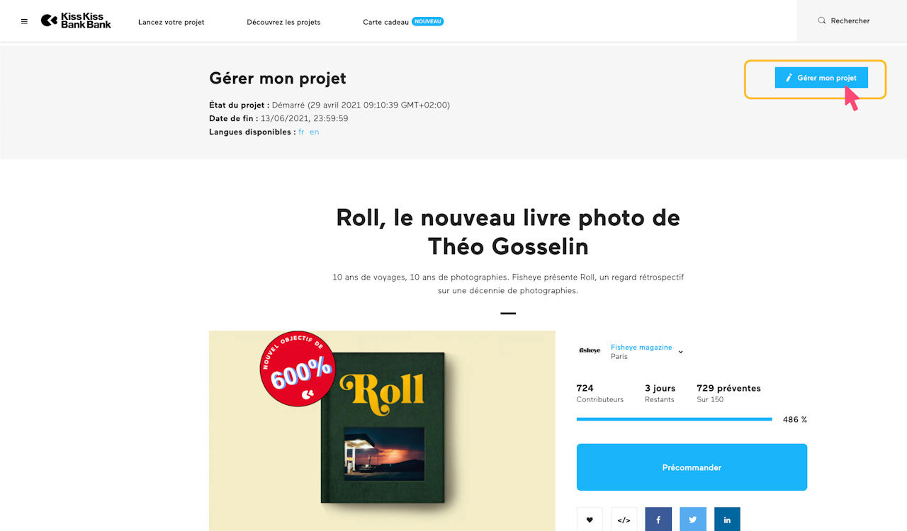 Connectez-vous à votre compte créateur.trice, rendez-vous sur la page de votre projet, cliquez sur le bouton Gérer mon projet.
