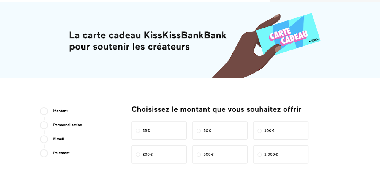 Un cadeau à offrir ? Envie de contribuer à des causes et à des projets qui vous tiennent à cœur ? Faites vous offrir une carte-cadeau KissKissBankBank ou offrez une carte-cadeau à l'un de vos proches.