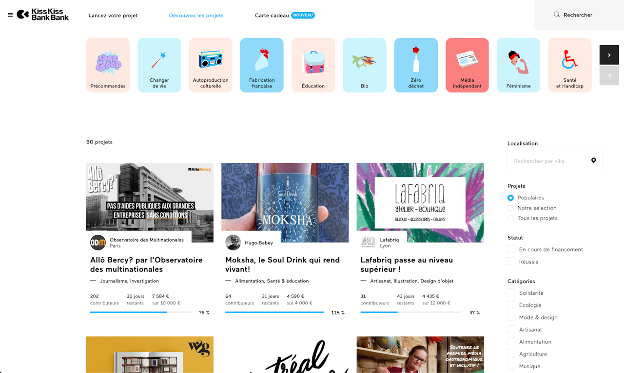 Cette carte est une occasion formidable pour précommander des créations made in France que vous trouverez nulle part ailleurs, des cosmétiques éco-responsables, vous abonner à des magazines indépendants ou encore soutenir des élans de solidarité. À vous de choisir parmi les projets en cours de campagne sur KissKissBankBank.