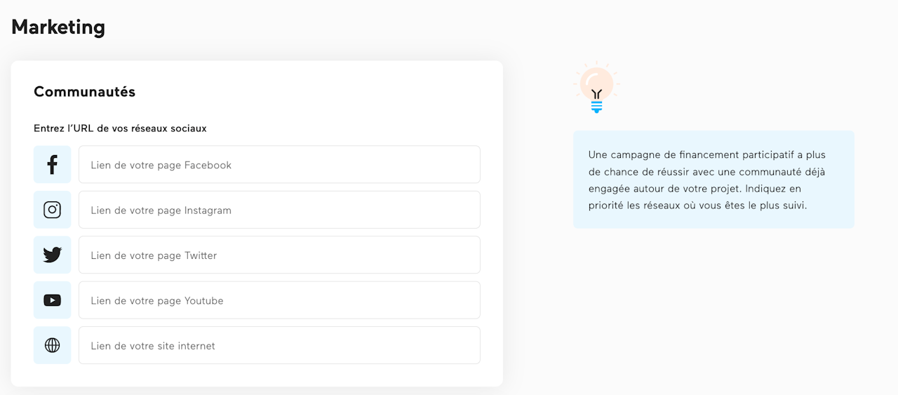 Nous vous encourageons à indiquer les liens des pages sur lesquelles vous êtes suivis pour votre projet.