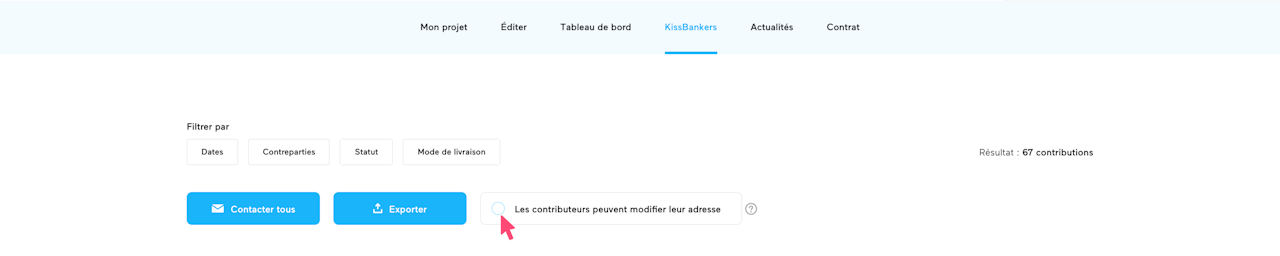 Pour cela, rendez-vous sur l'onglet Contributions de votre gestionnaire de projet et cliquez pour décochez cette option. Nous vous recommandons de communiquer à vos contributeurs/trices une date limite pour changer leur adresse pour ne pas les prendre au dépourvu.