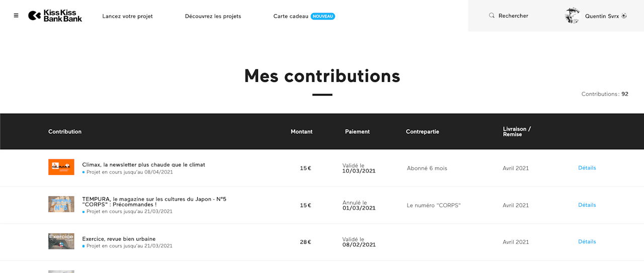L'historique et le détail de vos contributions se trouve sur la page Mes contributions de votre profil utilisateur.