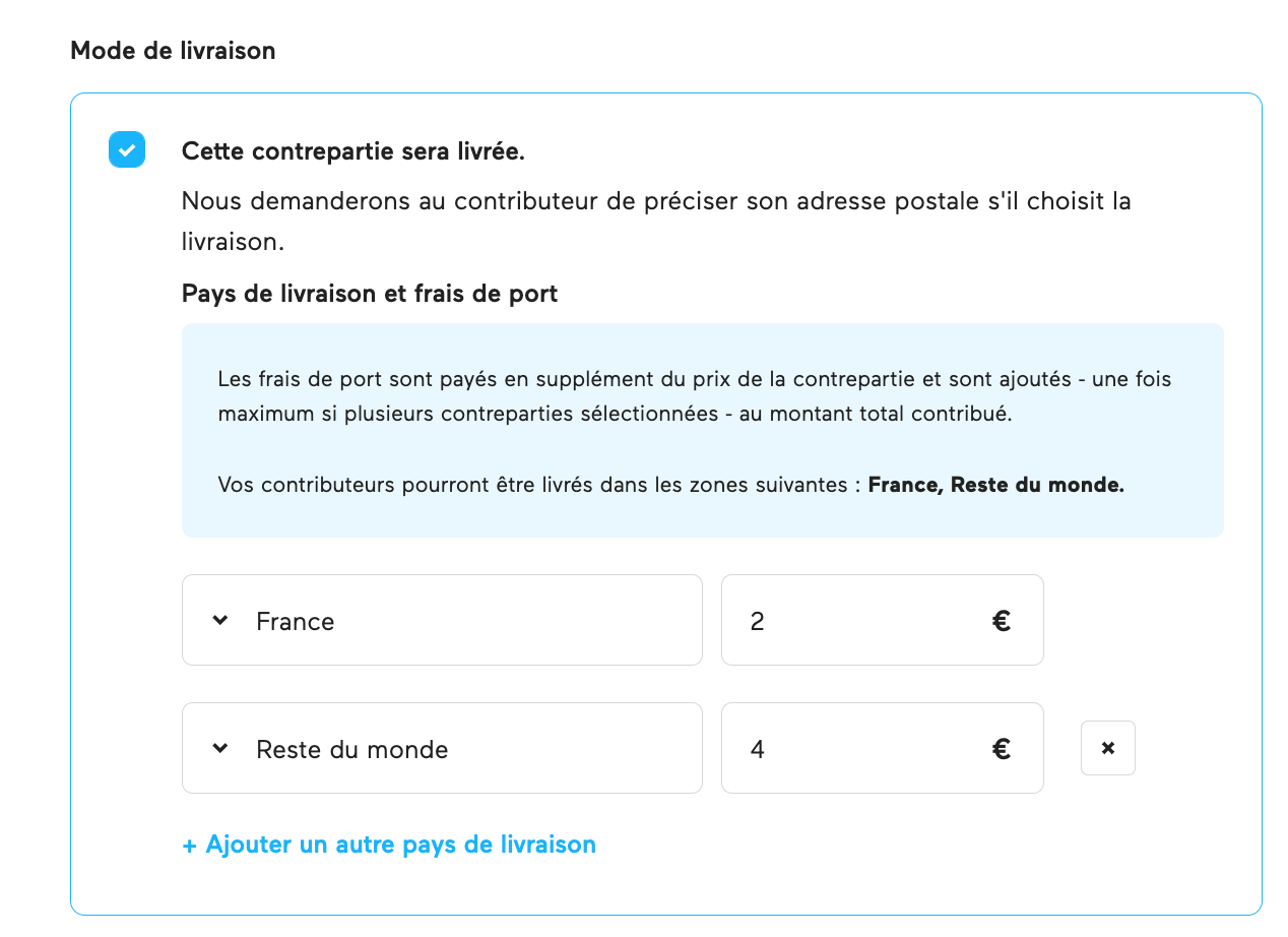 Lors de la création d'une contrepartie, vous pouvez définir le montant des frais de port que le contributeur devra payer pour recevoir sa contrepartie.